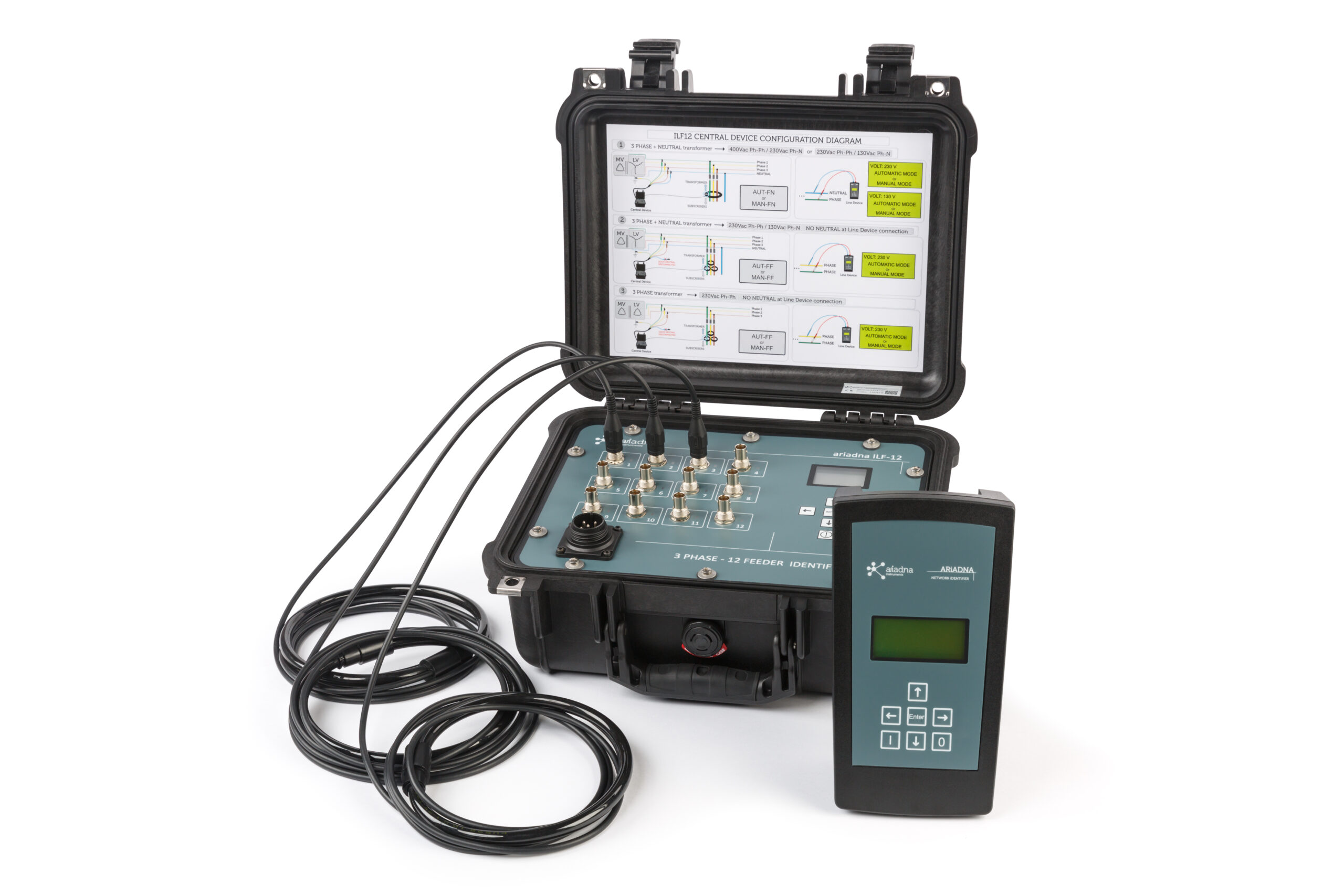 Equipo identificador de líneas y fases de Baja Tensión que identifica las 3 fases y hasta 12 líneas simultáneamente Ariadna ILF12. Este equipo determina la conectividad entre clientes y las distintas líneas y fases de un transformador de MT/BT de forma rápida y sencilla. Trabaja sin corte del suministro eléctrico, con lo que la calidad del servicio se mantiene en todo momento.
