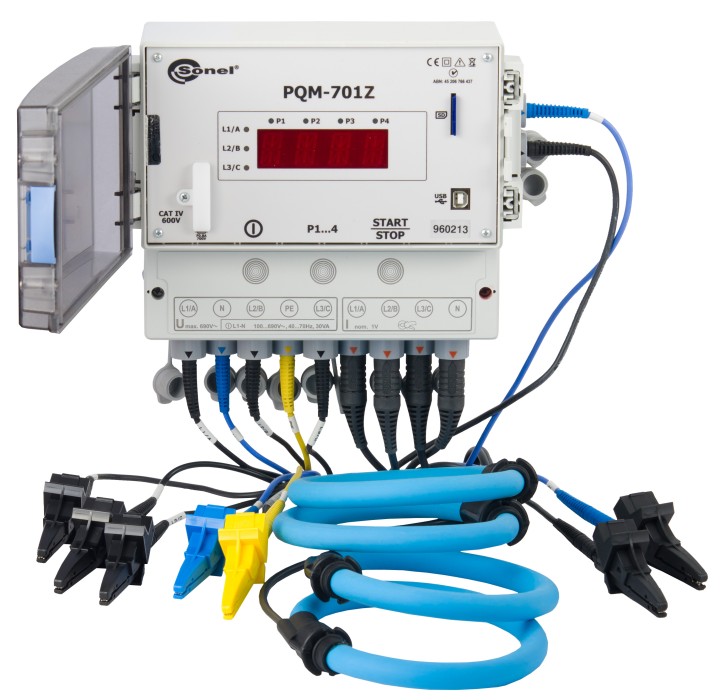 - Valores de tensión (L1,L2, L3, N-PE (cinco entradas de medición, según EN 61000-4-30 clase A) – valores max, medios, min,inst.hasta 690 V, posibilidad de trabajar con transductores de voltage.